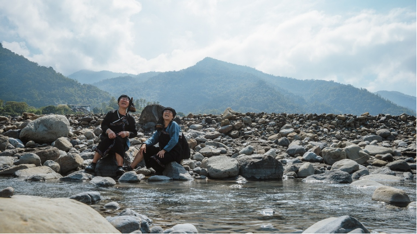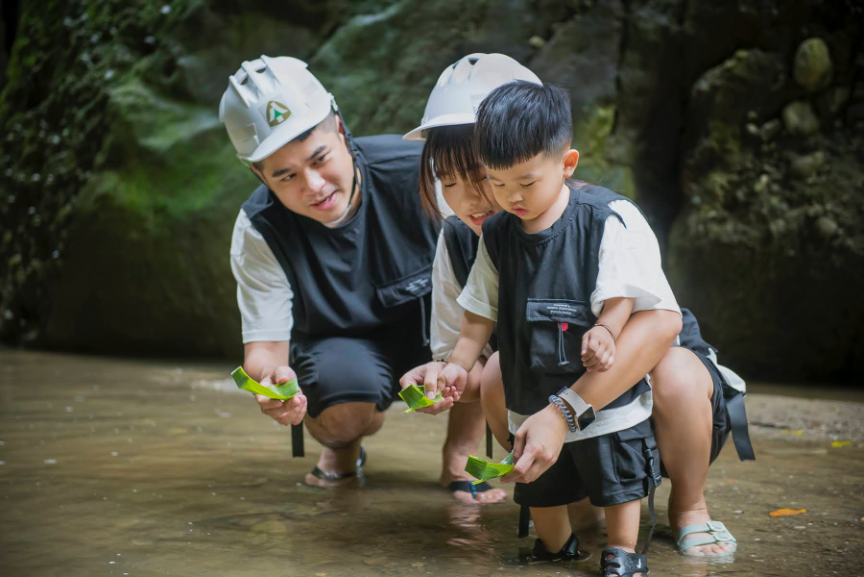 Image credit: Visitors playing with leaf boats in the Laonong stream – a traditional childhood game of the Luigui locals. Photo courtesy of the author.