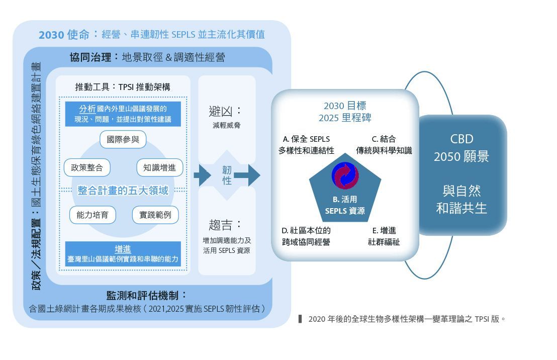 而經營及串聯具「趨 吉避凶」調適能力的韌性 SEPLS 的「推動工具」,即 是TPSI 推動架構。值得肯 定的是,TPSI推動架構的 五個面向,都已有具體的政 策、知識和實踐內容相對應,包括:1.整合相關政策 與策略:國土生態保育綠色 網絡建置計畫(以下簡稱國 土生態綠網)第I期2018 2021, 第II期2022-2025、 里山倡議與社區林業等相關 計畫;2.增進SEPLS保全活 用的知識和對策:SEPLS韌 性評估(工作坊)融入調適 性經營;3.強化國際參與和 貢獻:臺灣IPSI會員的國際 參與和貢獻(截至2022年 有20位會員);4.促進社 區、農民與民間團體交流及 能力培育以及國土生態綠 網;5.里山倡議實踐範例之 分享與串聯:2016年以來 之TPSI分區及全區之常年 性及主題性交流活動。