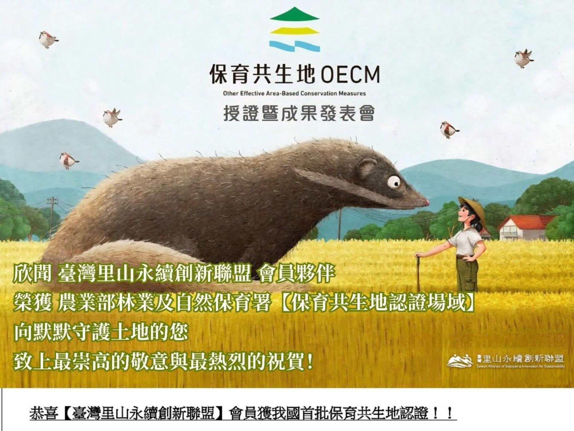 農業部林業及自然保育署於昨日(3/25)舉行「114年度保育共生地授證暨成果發表會」,本聯盟(TASIS)多位會員夥伴憑藉長期在土地經營與生物多樣性維護上的傑出表現,正式獲得國家首批「保育共生地(OECM)」認證!